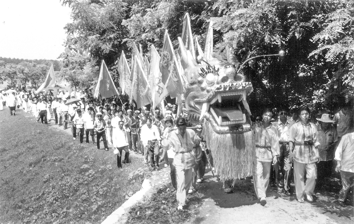 1990年6月,参加岳阳国际龙舟节的中外龙舟队员前往屈子祠祭龙头。