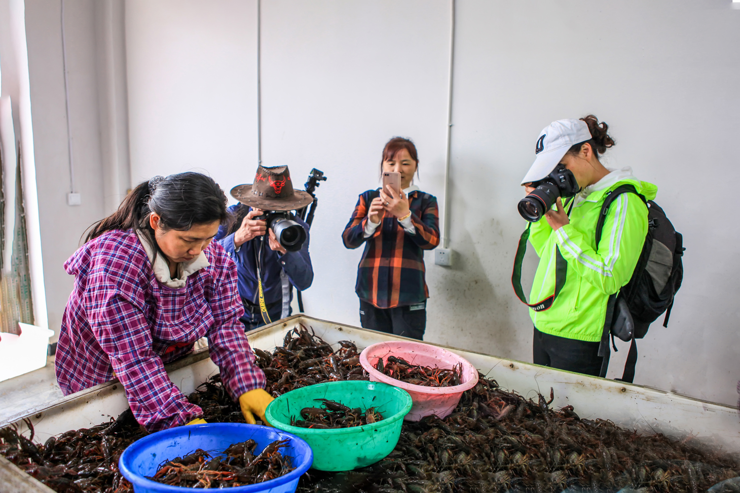 君山区钱粮湖镇依托洞庭湖的优良环境和水源丰富等优势条件,大力发展清水小龙虾产业,成为岳阳市最大的龙虾交易中心,当地村民因此走上了致富路。到达目的地钱粮湖龙虾小镇集散中心后,眼前火爆的交易场景让人赞叹。大家立马扛起“长枪短炮”寻找不同的角度,肆意挥洒自己的创作热情。