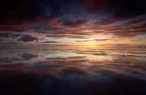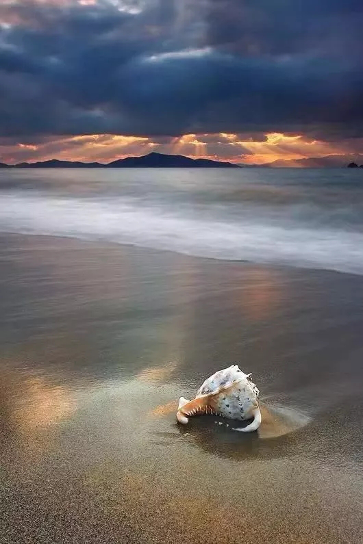 大家的第一视觉落脚点应该在画面下部的海螺,之后才顺着画面纵深看到远处的霞光。