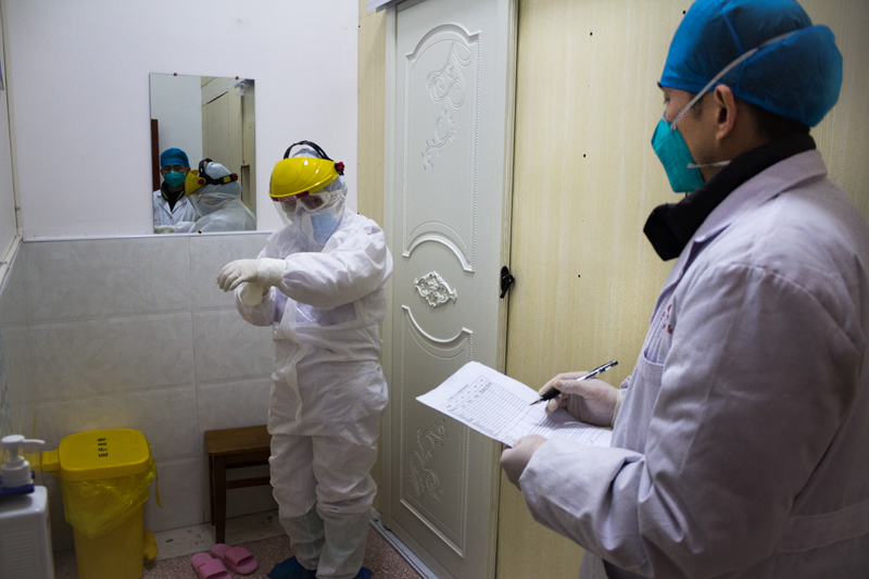 穿好防护服的护士,准备进入隔离病房为医学观察对象采集标本。