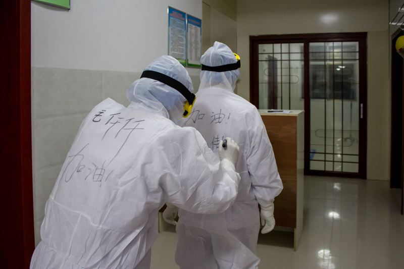 在隔离病区,医护人员化身“蒙面人”,只能从书写在他们隔离服外的名字相互辨认。