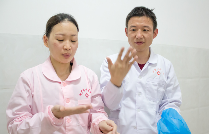 由于长时间穿着密不透风的防护服,戴着双层手套,医生江潮科和护士黄宇的双手被汗水浸泡到发白、发麻。