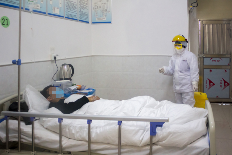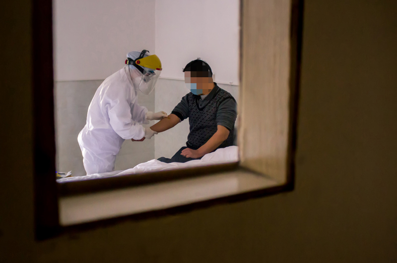 隔离病房内,护士在为医学观察对象输液前,对外周静脉留置针进行检查。