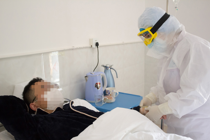 隔离病房内,护士正在为医学观察对象测量血压和血氧饱和度。