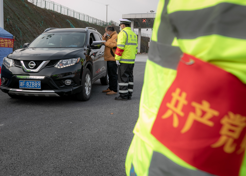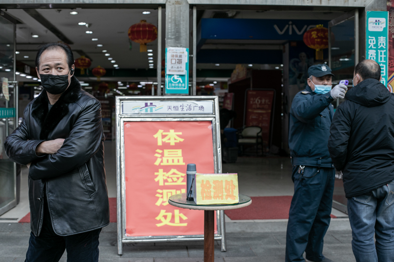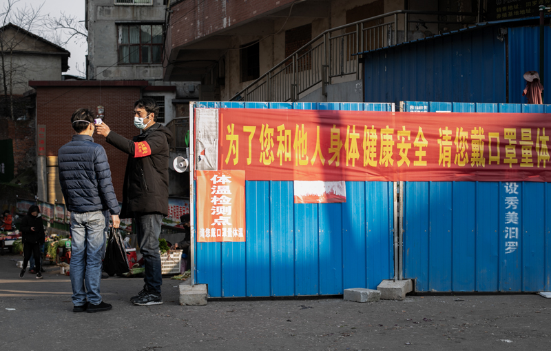 《配合》农贸市场的各个入口设置了检查点,没戴口罩没测体温者禁止入内。这个帅小伙面对执勤人员的“枪口”,撩开额前的头发,主动配合。