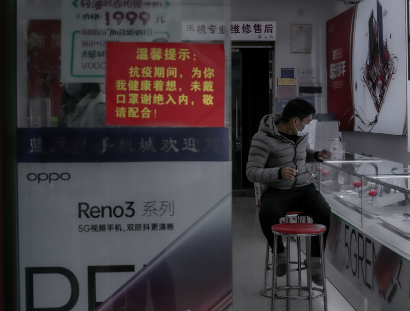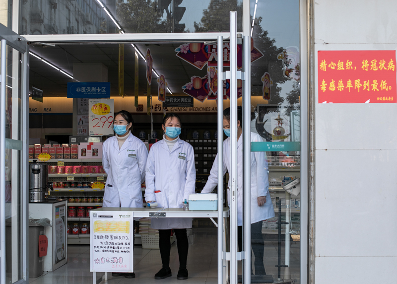 《严阵以待》疫情防控期间,药店既要满足市民的需求,还要做好各种防护。站在药店门口的员工时刻准备着为顾客做检查。为了疫情早日解除,每个人都在努力。