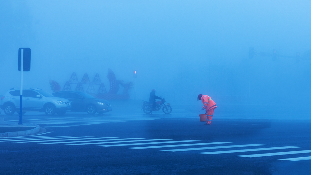 《坚守》正月初四清晨,沿江大道,雾蒙蒙,环卫工人在保洁。新冠疫情暴发以来,环卫工人始终坚守岗位,为筑牢疫情防控的“环卫防线”默默奉献。易长庚摄