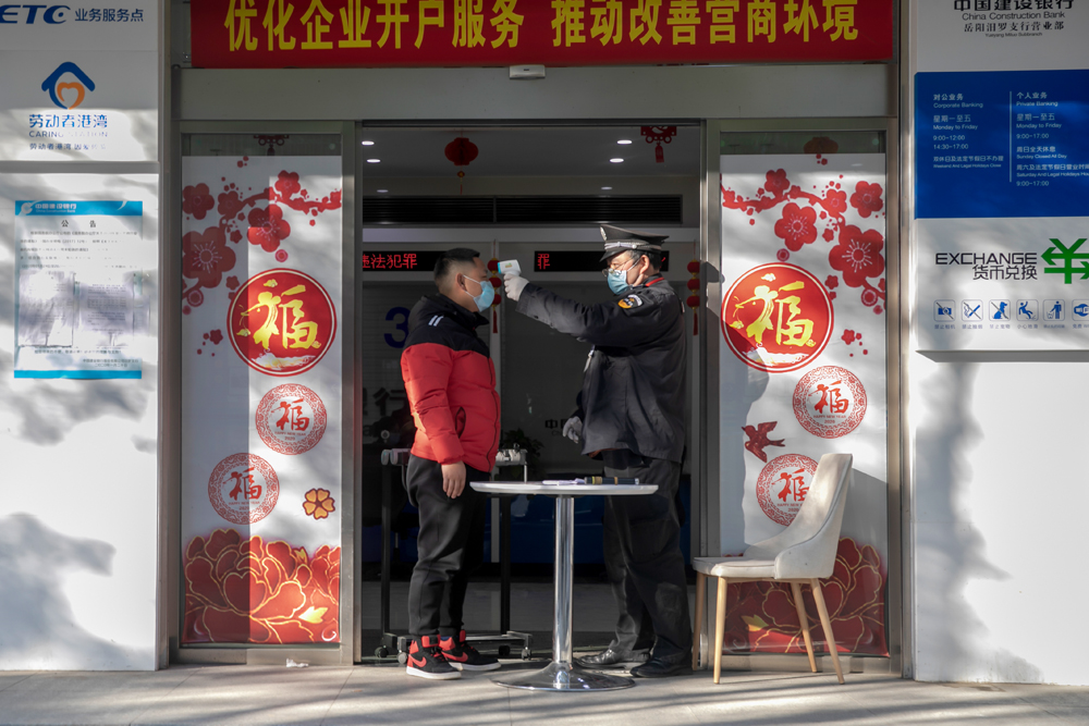 《暖心之“卡”》建设银行汨罗支行在营业厅入口设置了一道“关卡”, 保安人员在卡口为顾客测量体温、登记信息,并提醒顾客正确戴好口罩、排队保持距离。余艳摄