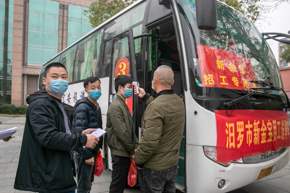 《暖心之旅》2月26日,一批务工人员踏上返岗复工的旅途。与以往不同是,今年他们乘坐的是“返岗直通专车”。 出发前,人社部门组织对车辆进行了全面消毒,对出行人员测量体温,让返岗就业人员“安心”又“暖心”。余艳摄