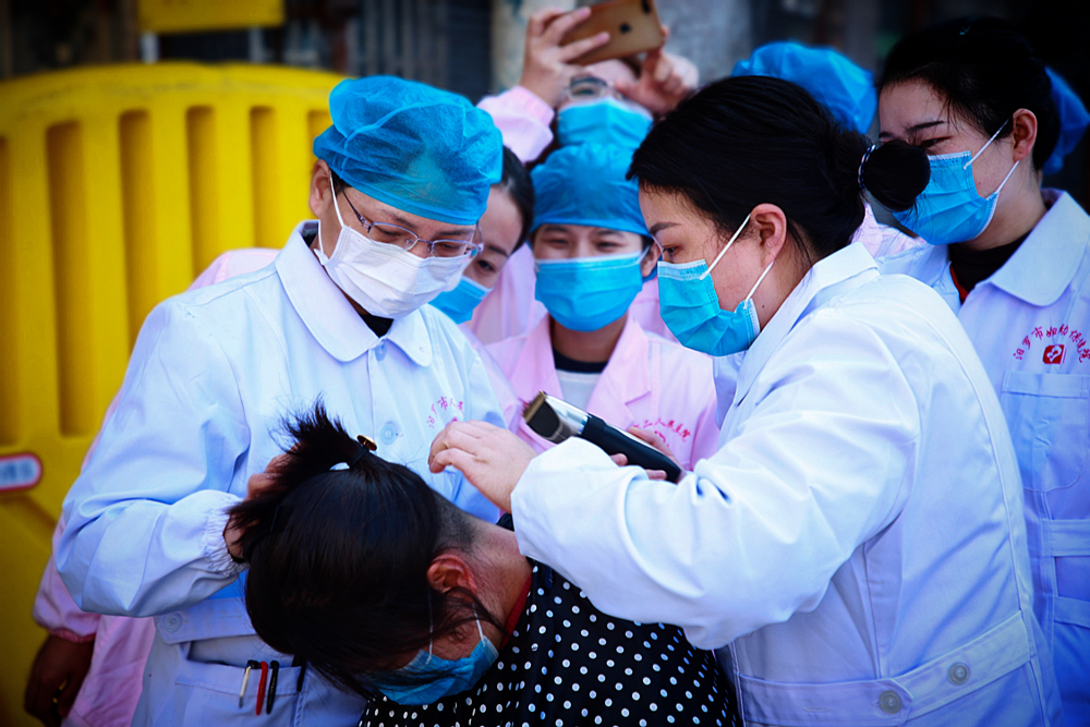 《剪发上“战”场 》2月5日,为降低被感染的风险,汨罗市新冠肺炎第二隔离病区的护士剪掉长发后投入战斗。 胡清摄