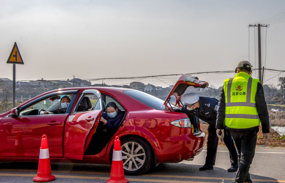 《严查细检》1月31日,汨罗镇新冠肺炎疫情防控值守点,交警打开车辆后备箱,认真检查是否有违规、违禁物品。徐国良摄