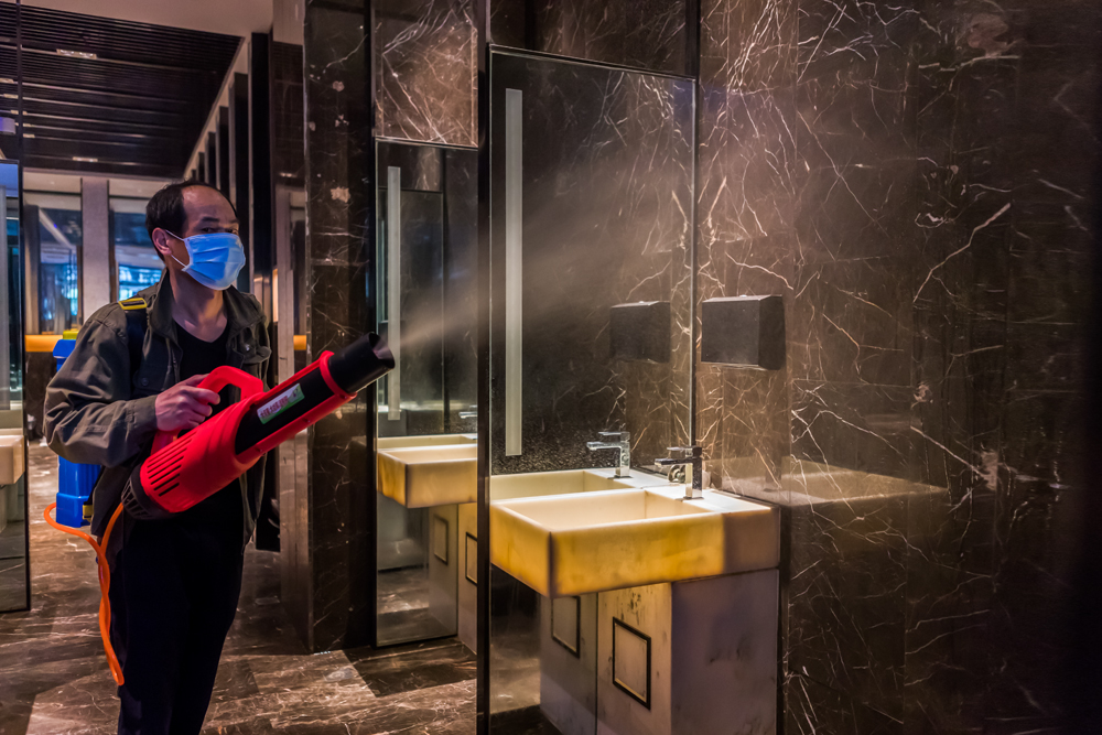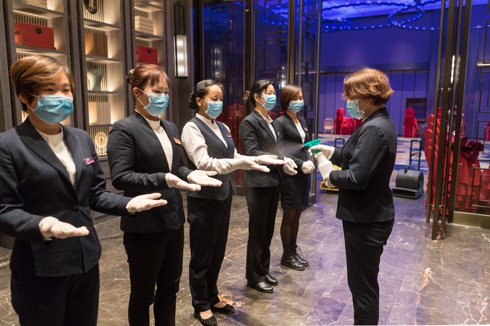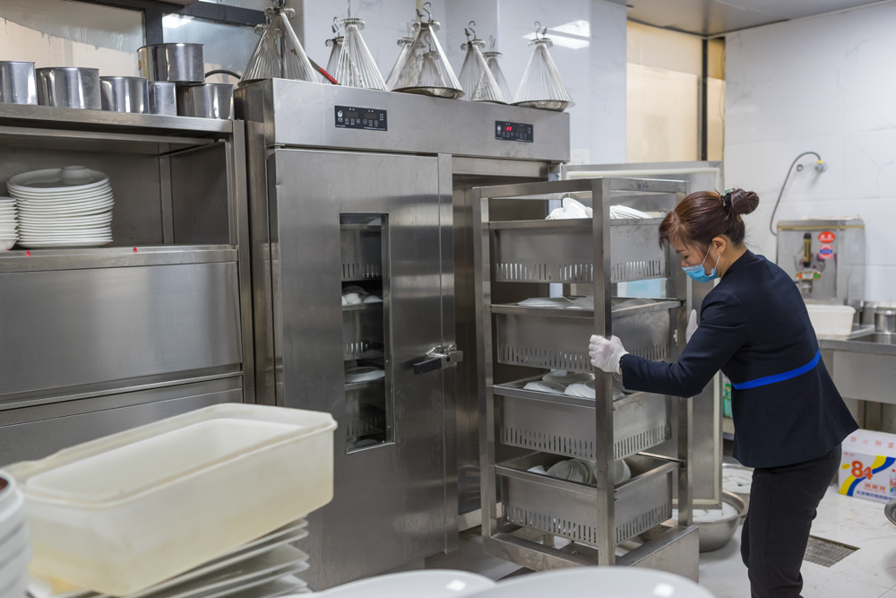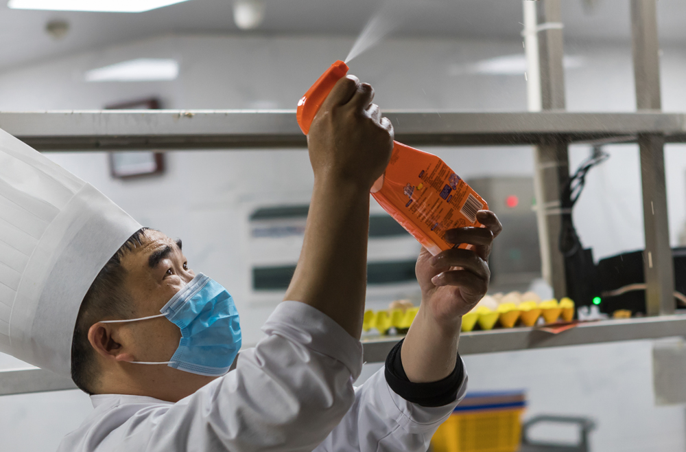 酒店制定了十分全面的消杀流程,对厨房、宴会厅、包厢、楼道、洗手间、电梯等场所和设备按要求进行全面消毒