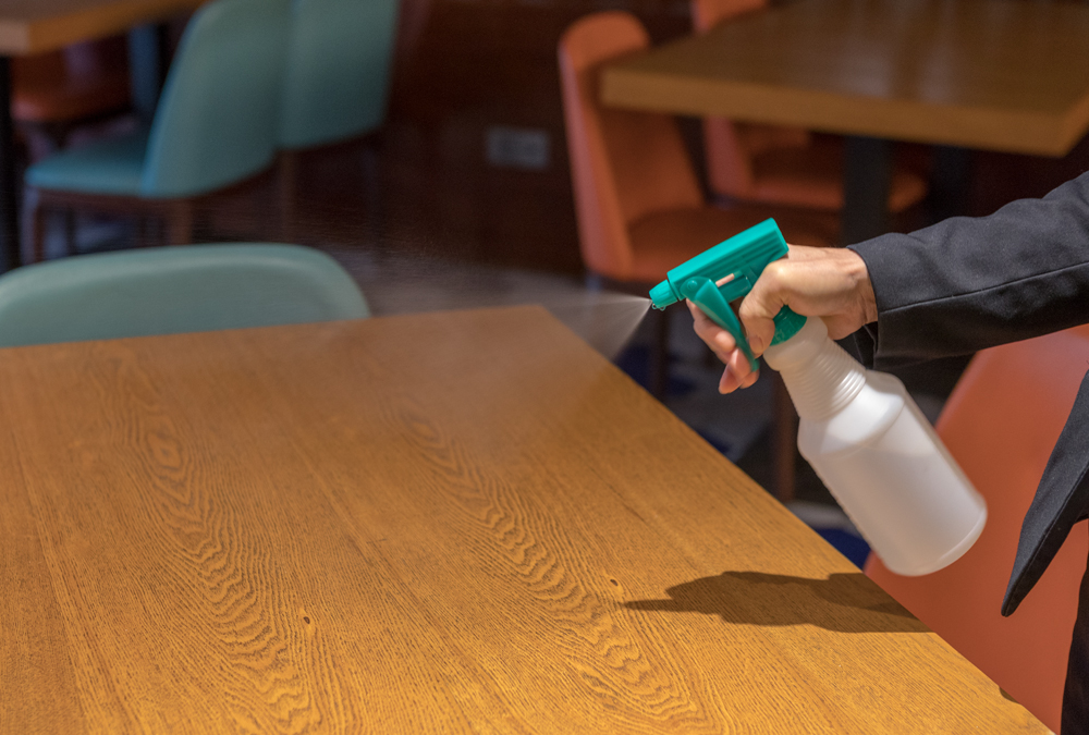 服务员摆放餐具和传菜前用酒精消毒手套