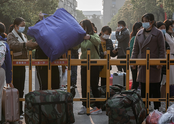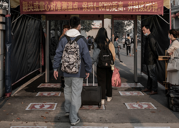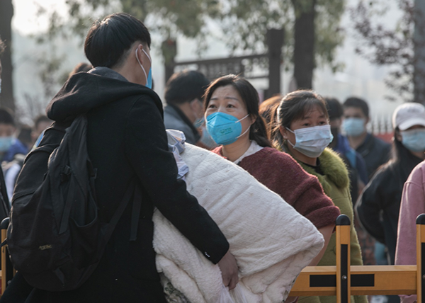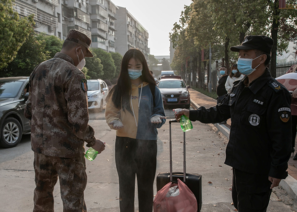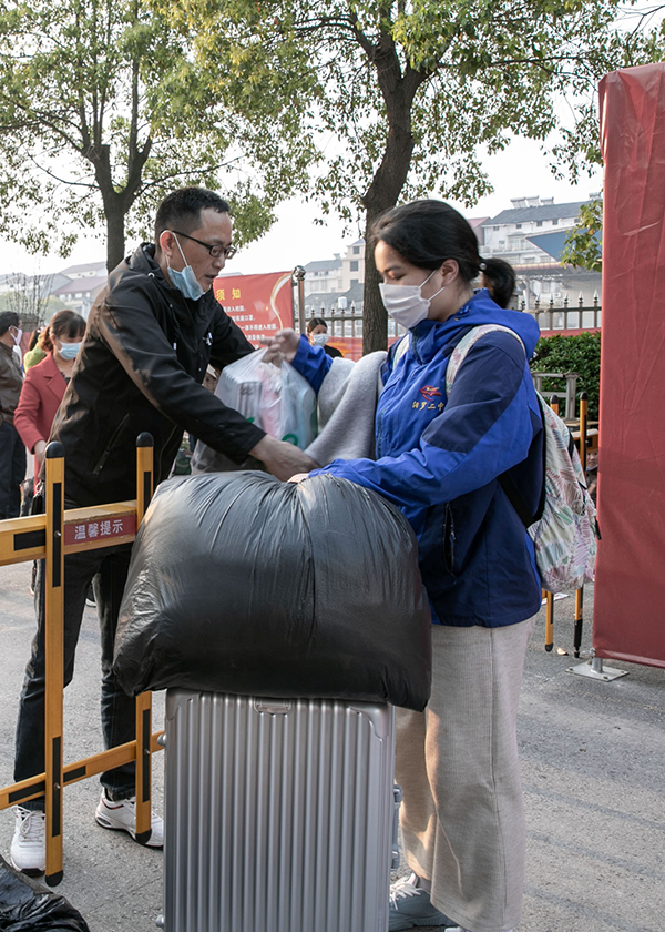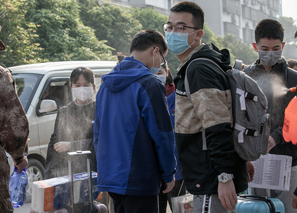 一大早,家长们陆陆续续送学生入校。进入红外检测通道之前,所有的家长和学生以及行李都要先用酒精喷洒消毒。>>>