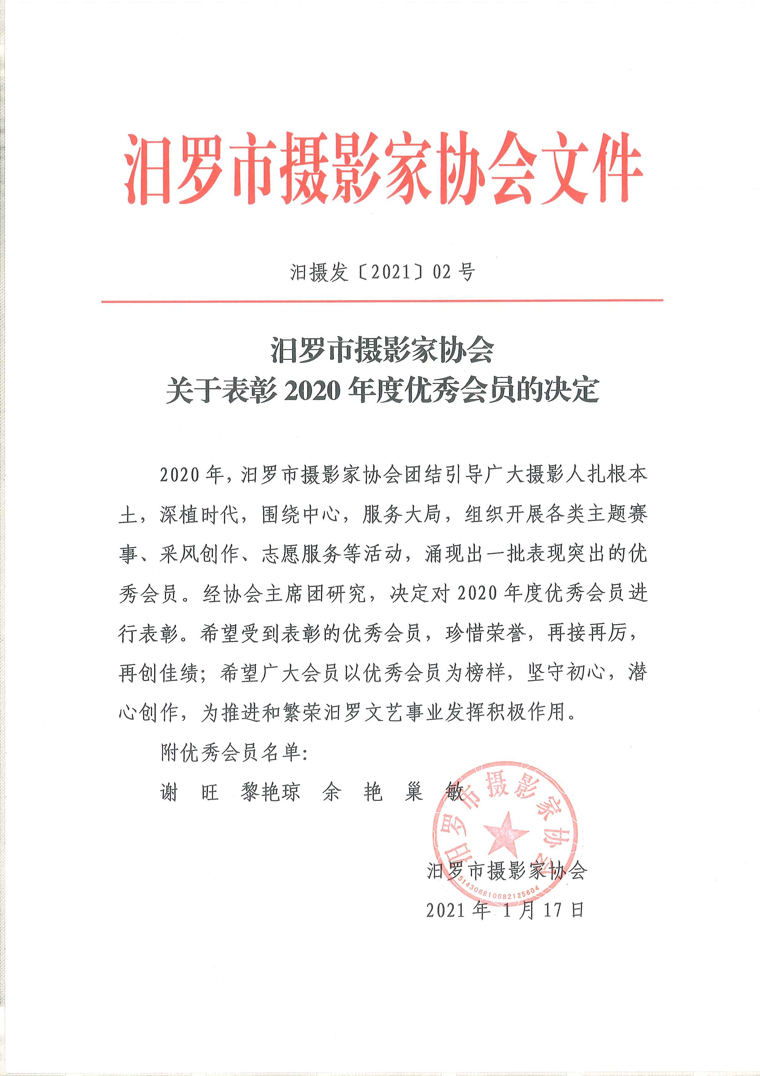 关于表彰2020年度优秀会员的决定